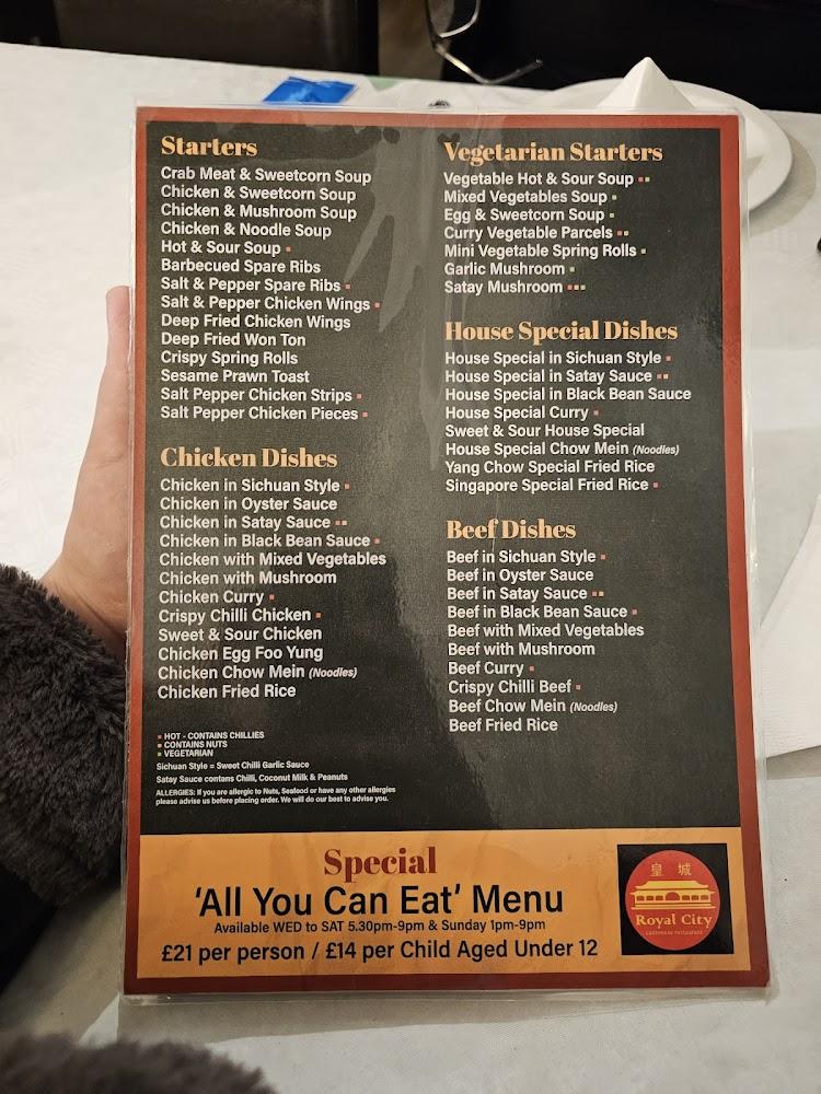 Located a stone's throw from the heart of Huddersfield, Royal City stands at 313 Old Wakefield Rd, Moldgreen, HD5 8AA. The area is easily accessible, with ample free parking nearby. As an inviting spot, it attracts a diverse crowd including groups, tourists, and locals seeking a casual dining atmosphere. The restaurant is well-known for its rolling lunch and dinner service, making it a popular choice for solo diners and family outings alike. Visitors can enjoy a cozy, informal environment, which is particularly welcoming to kids, thanks to a menu that caters to younger tastes as well. Accessibility is a priority here: the entrance and seating areas are wheelchair-friendly, ensuring everyone can enjoy the experience. Whether reserving a table or walking in, guests will quickly find themselves part of the Royal City community, where food and good company take center stage.